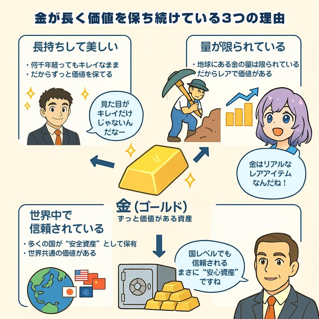 いい質問だね! 金には、“見た目がキレイ”だけじゃない大切なポイントがいくつかあるんだよ〜